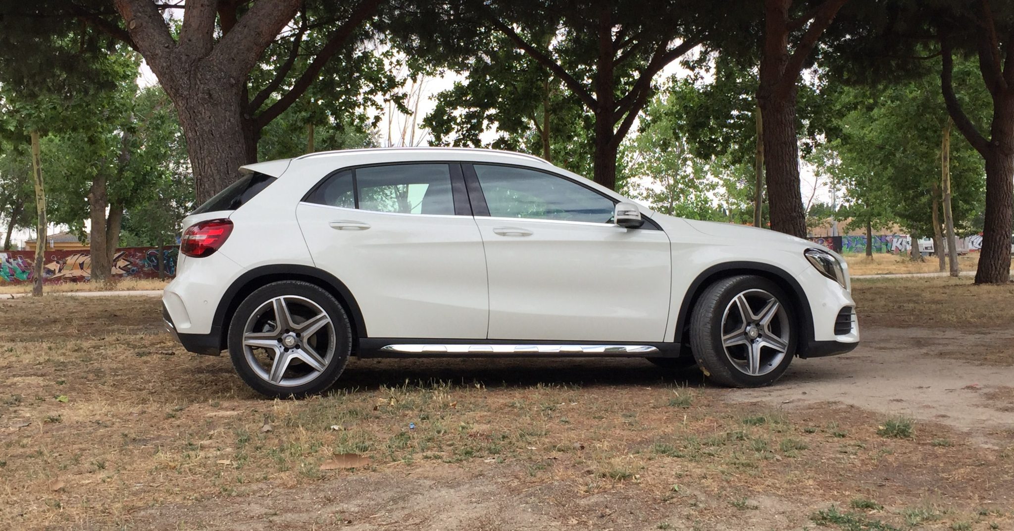El GLA ha recibido, desde su versión anterior, ligeros retoques en el exterior. Con unas medidas de 4.424 mm de longitud, 2.022 mm de ancho -retrovisores incluidos- y una altura libre al suelo de 16 cm, los retoques estéticos llaman poderosamente la atención, como por ejemplo su parrilla frontal con acabado AMG line, en esta unidad. Llantas de aleación de 5 radios color gris titanio y pulidas con alto brillo y con el logo de AMG.
