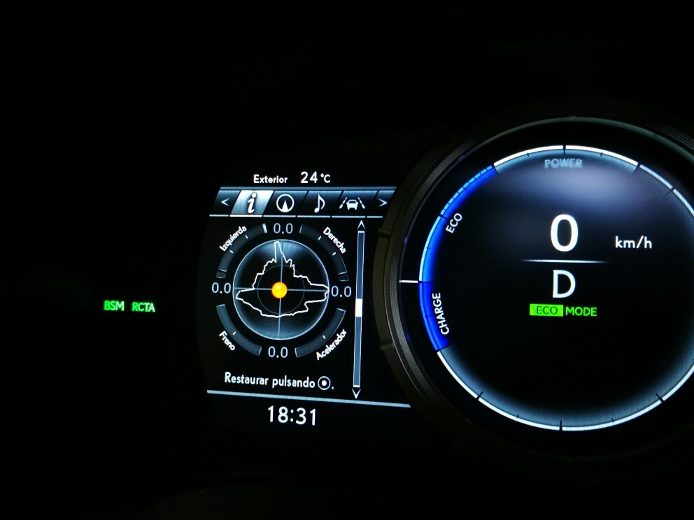 Es típico en Lexus y en su panel de instrumentos del F Sport incorporar un diseño dinámico que muestra los principales datos de conducción. Además, está conectado al selector de diferentes tipos de conducción para modificar su estado en función de los ajustes del modo de seleccionado. Eco y Sport +. Algo que no es tan interesante como en otros modelos más deportivos como el RCF l el GSF es la info que muestra de las cargas G´s, pero bueno, es el sistema que montan en todos y no hacen diferencias entre ellos. No obstante, la información nunca está de más.