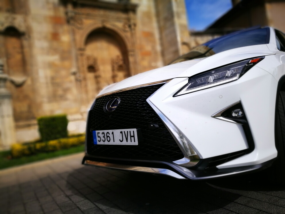 Normalmente no nos gusta hablar del exterior, porque en definitiva hablaríamos de algo que todos vosotros podéis ver con vuestros propios ojos, pero en este modelo actual el RX 450h en su máxima expresión de atrevimiento con el diseño del F SPORT, incluye una acentuada “parrilla en doble punta de flecha” y amplias llantas de aleación de 20 pulgadas que han hecho que por su estética tan remarcada, estilizada y “diferente” hayan sido el foco de atención de miradas en el centro de la ciudad de León, donde hicimos esta prueba. Así que, os dejamos esta fotito del frontal para que veáis la potencia que transmite su aspecto visual.