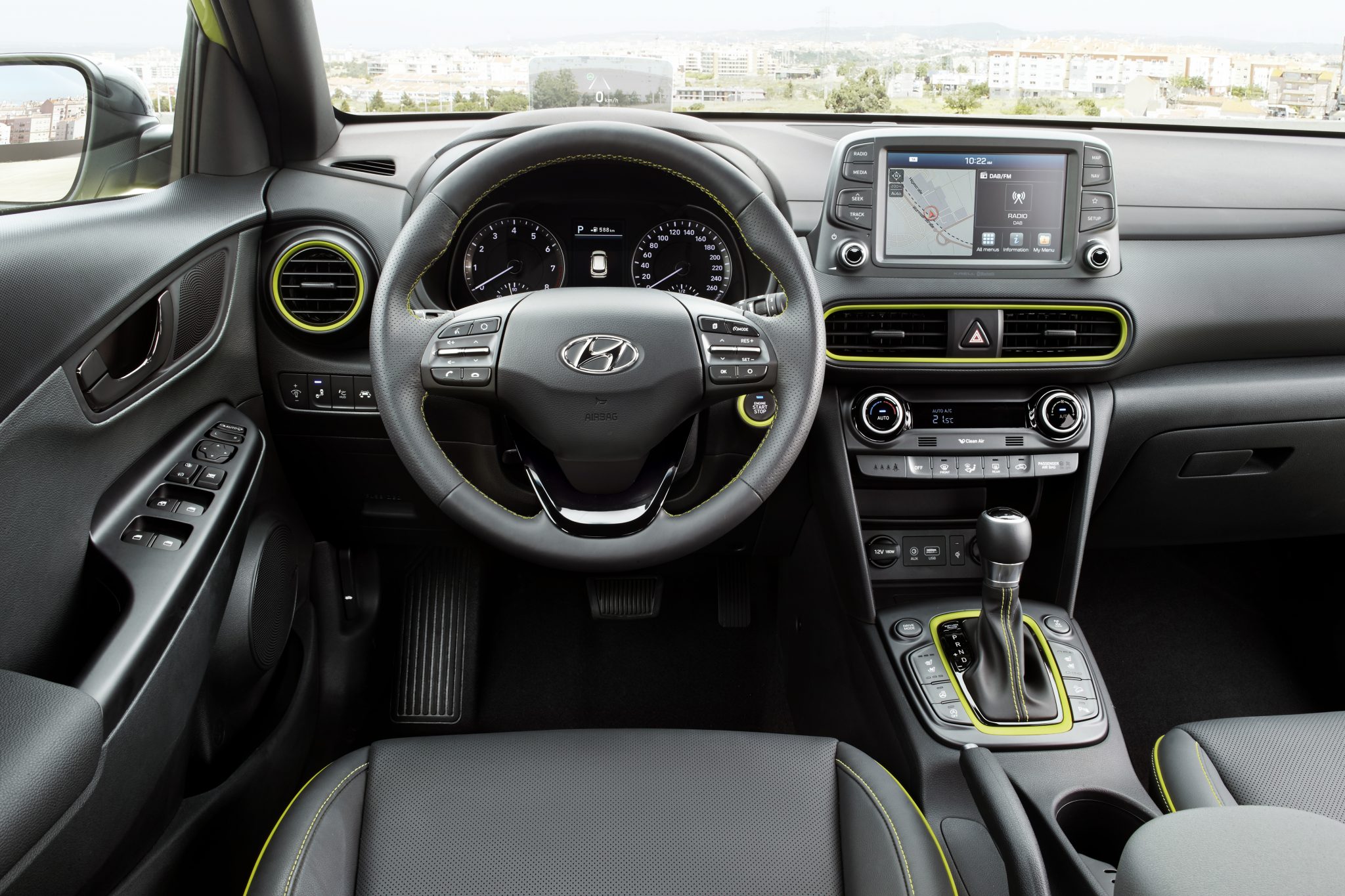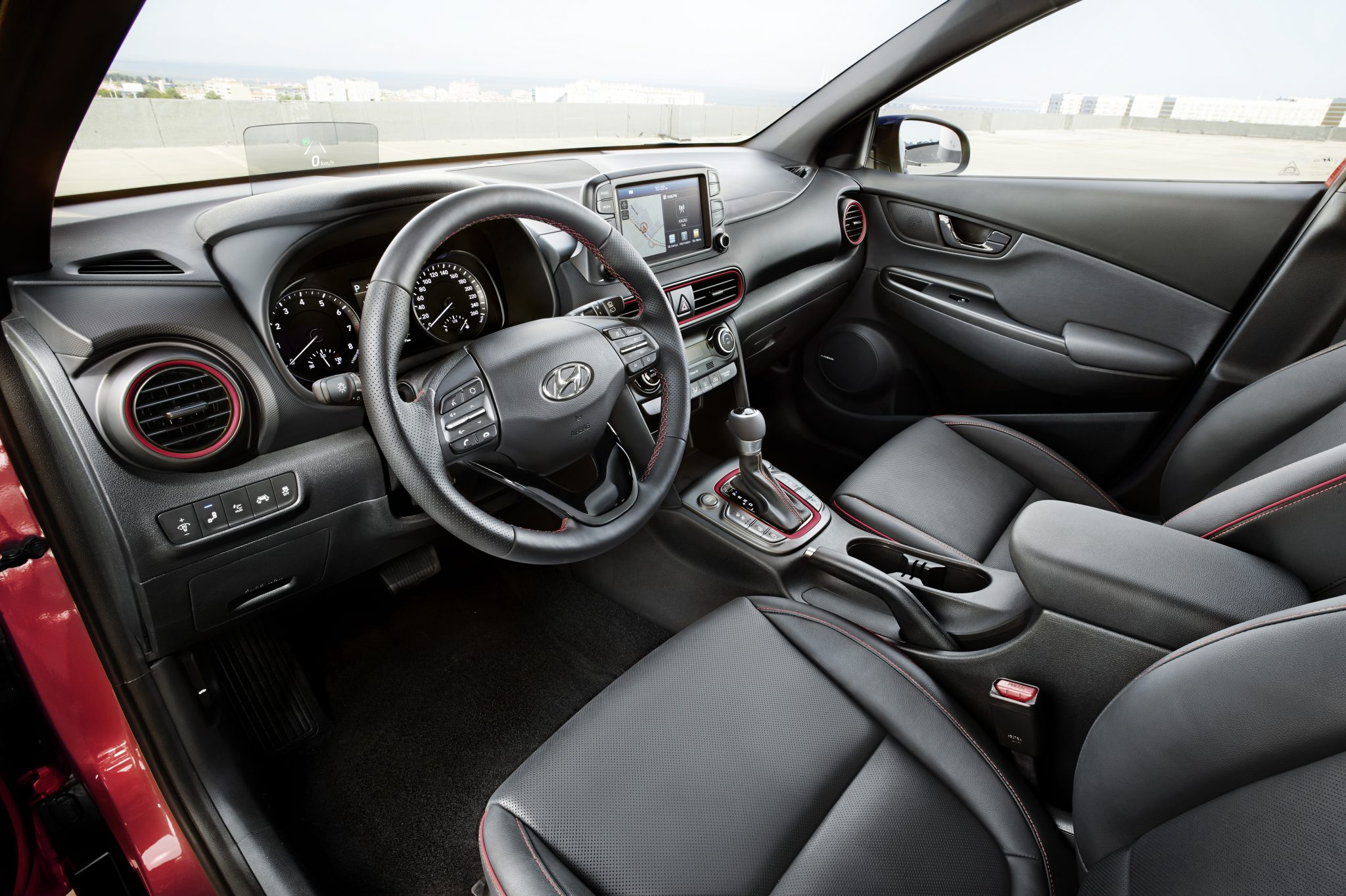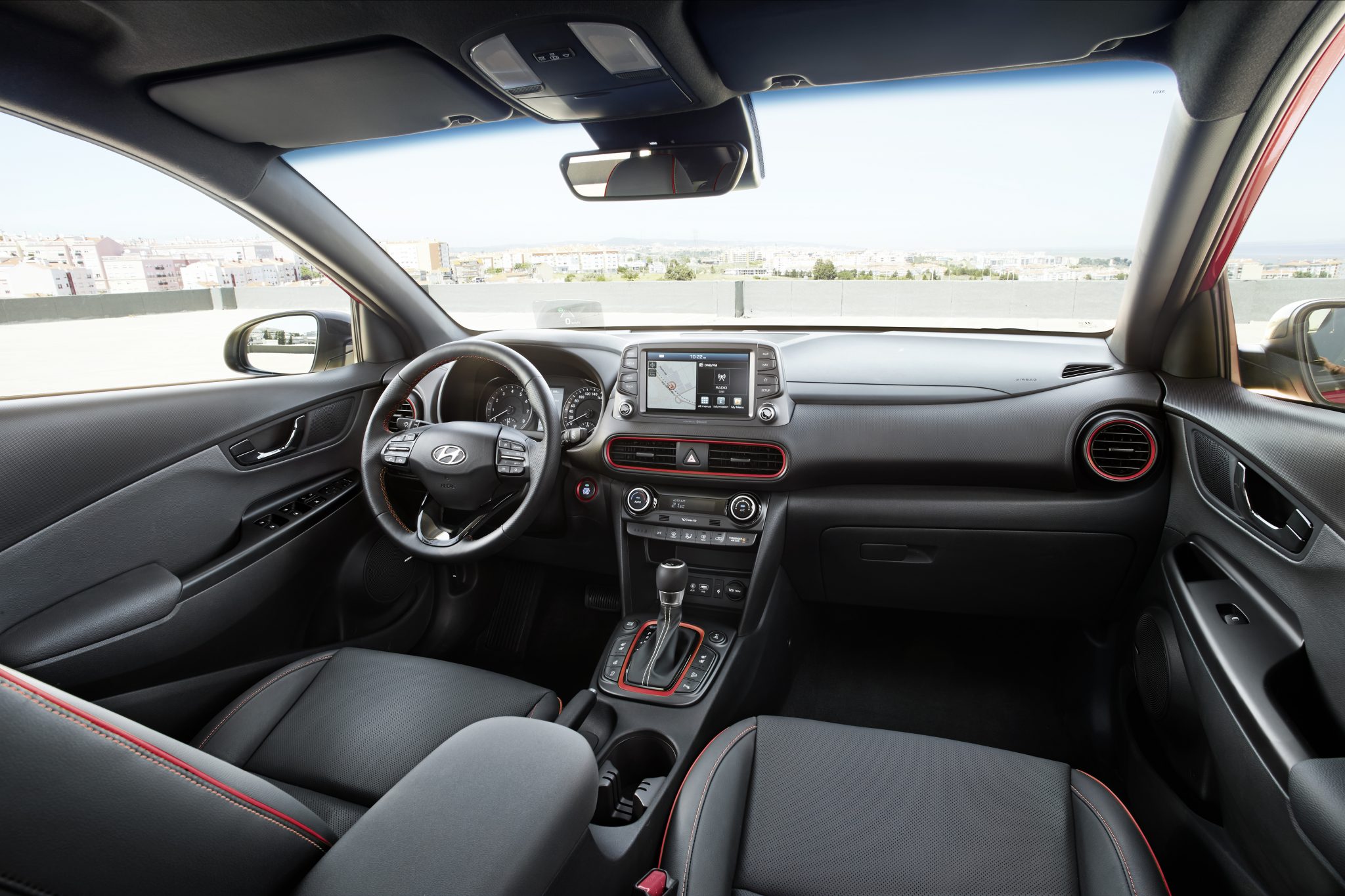 Las costuras tintadas en los asientos y el volante, así como los embellecedores que enmarcan las diferentes salidas del sistema de ventilación interior dan un toque de elegancia al habitáculo del KONA.