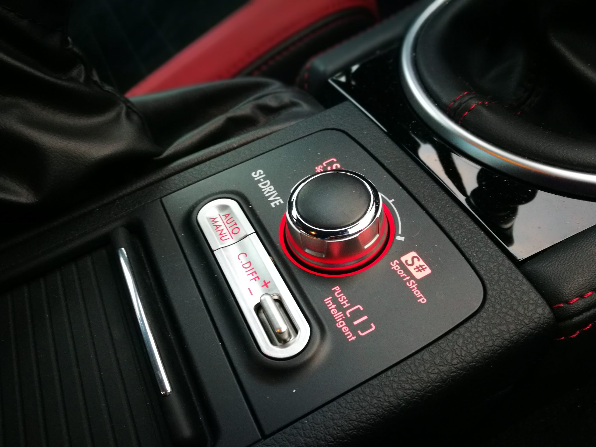 Deciros que disponemos de un selector con varios mapas de motor, que nos cambiarán la curva de entrega de potencia. Podemos optar por una curva más lineal y suave con el modo “Intelligent“, una curva cañera si ponemos el modo “Sport” o bien tener toda la caballería disponible con el modo “Sport Sharp” (Sport#), aunque, como os he dicho, en ciudad es hasta un pelín incómodo a mi juicio, es demasiado brusco y sensible al menor toque de acelerador, eso sí, en este modo el STI hace gala de su apellido y saca pecho por la contundencia de la entrega.