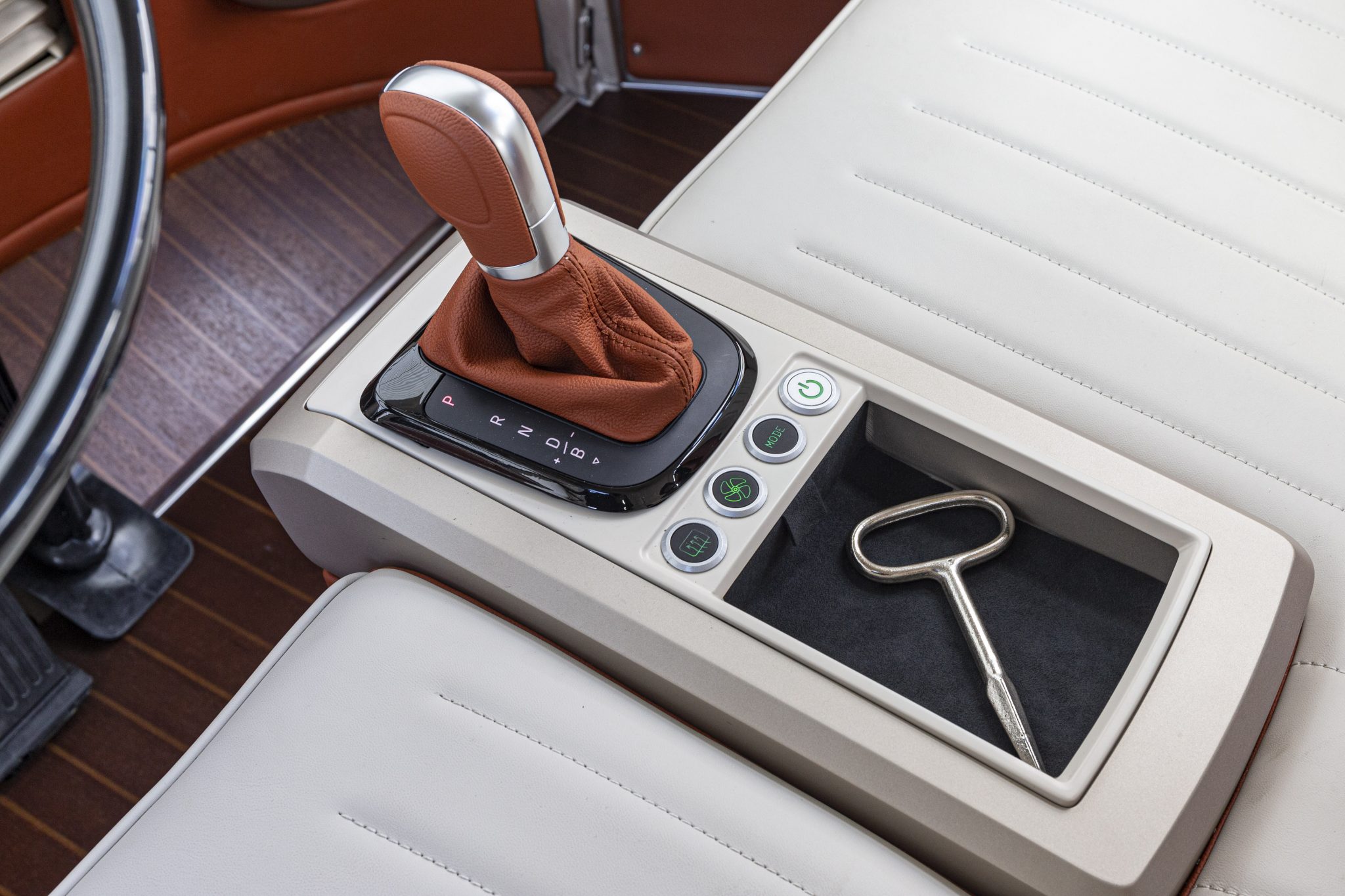 Los asientos son una de las nuevas características. En la línea del acabado exterior, también vienen en dos colores: “Saint Tropez” y “Naranja Saffrano”. La nueva palanca de cambios de la transmisión automática está situada entre el conductor y el asiento del acompañante. El botón start/stop del motor eléctrico también está integrado en la consola. El suelo está recubierto con madera sólida, que imita el aspecto de la cubierta de un barco. Como resultado de esto y de los agradables tonos claros de cuero, este Samba Bus electrificado transmite sensaciones marítimas. La impresión se ve reforzada por el gran techo panorámico retráctil.