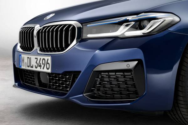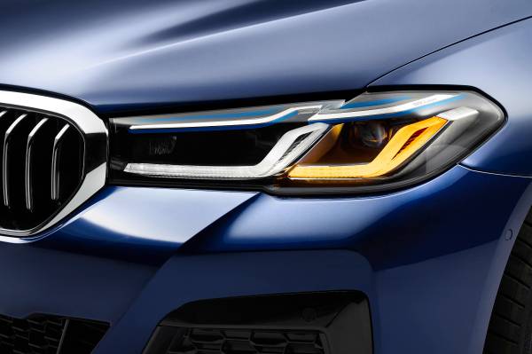 Como opción, se ofrecen nuevos faros con todas sus funciones por LED que incluyen la iluminación adaptativa en curva, el asistente de luz de carretera con antideslumbramiento con tecnología matrix y el cambio de luz automático. La iluminación láser de BMW ahora también está disponible como opción en todas las versiones de la Serie 5. En estos dos equipos opcionales, las luces de conducción diurna también actúan de intermitentes.