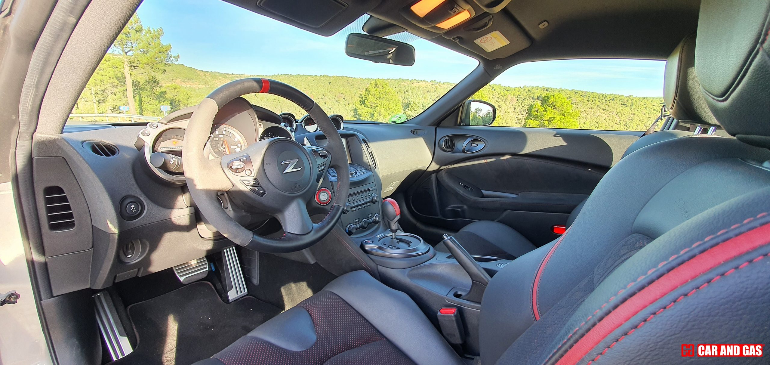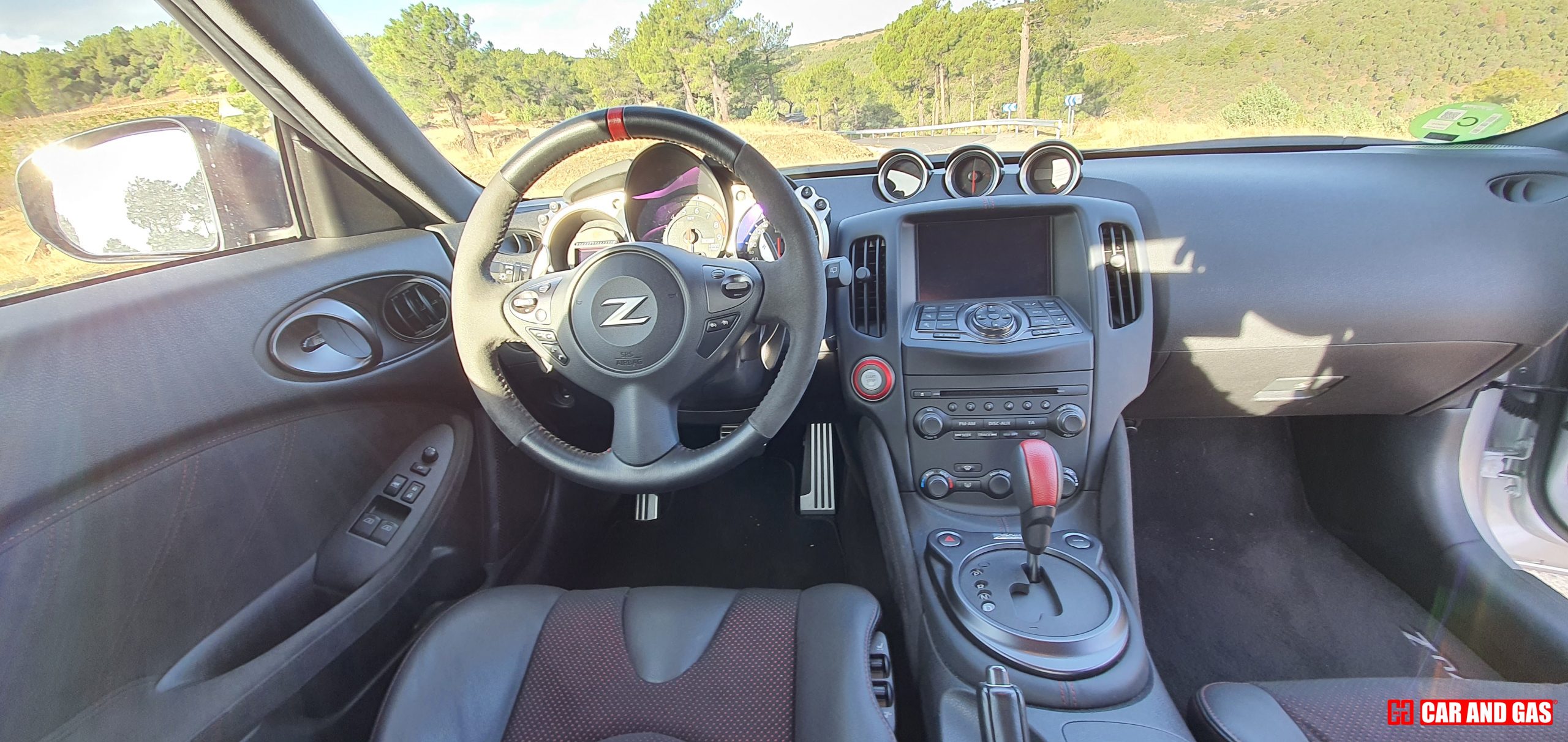 En el interior de este Nissan 370z 50 Aniversario tenemos varios detalles para distinguirlo de un 370z normal: logotipos en el tacómetro y respaldo del asiento, volante y otros detalles forrado en alcántara y pespuntes rojos en varias zonas del salpicadero. Como podéis fijaros, la diferencia más importante la tenemos en el exterior.