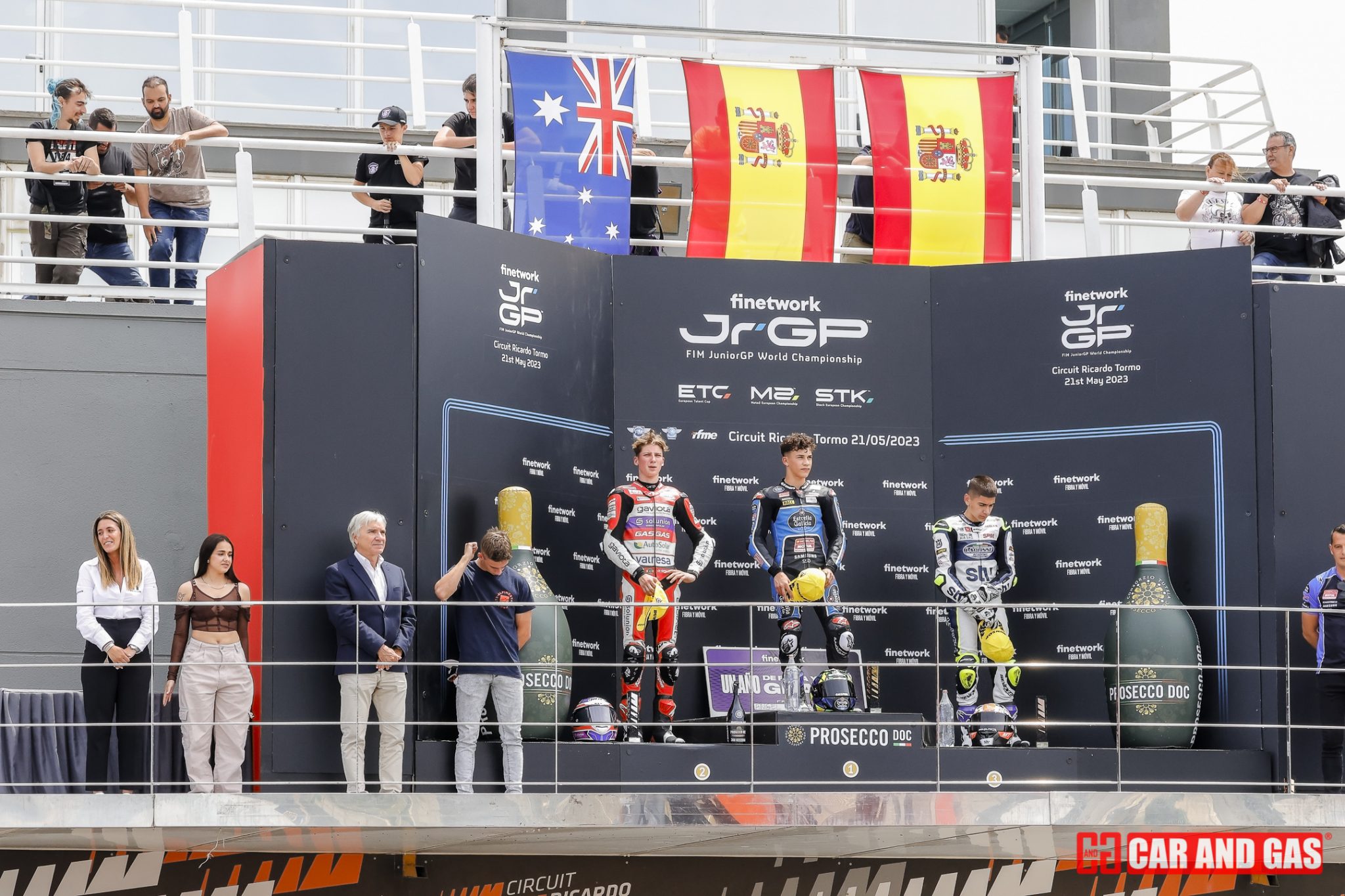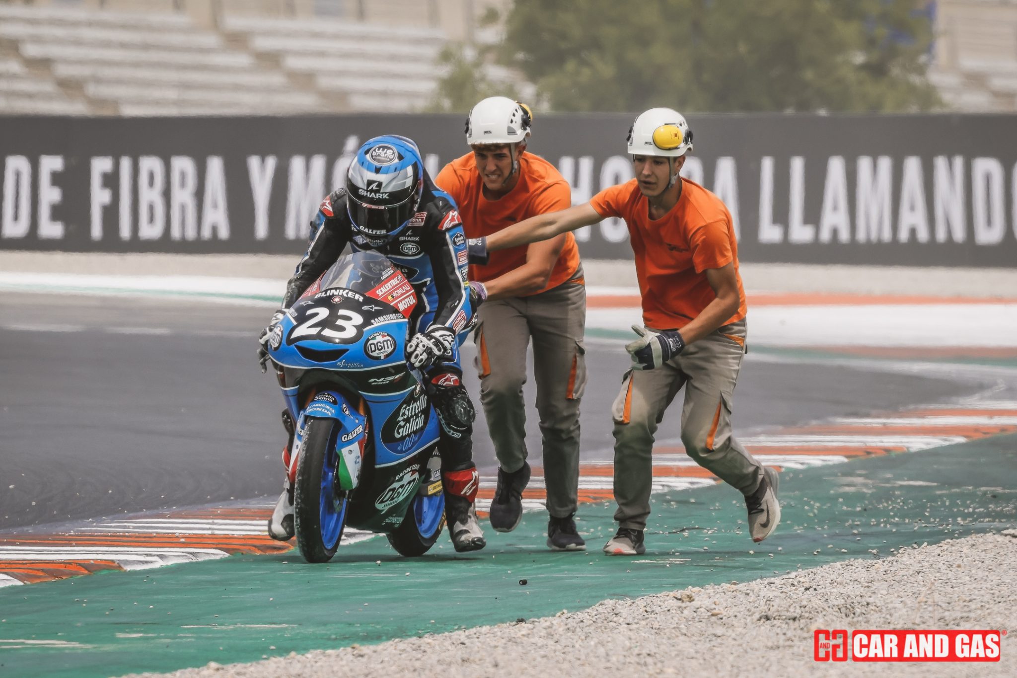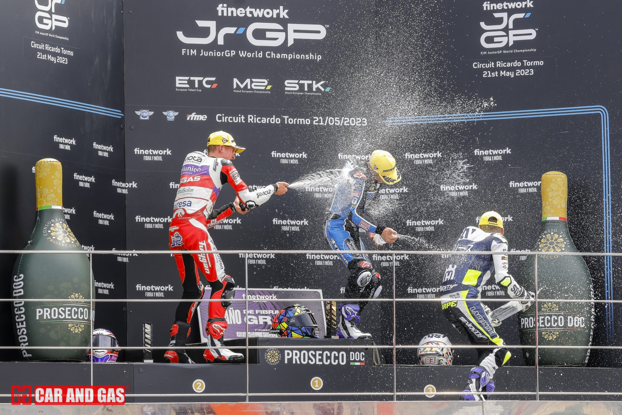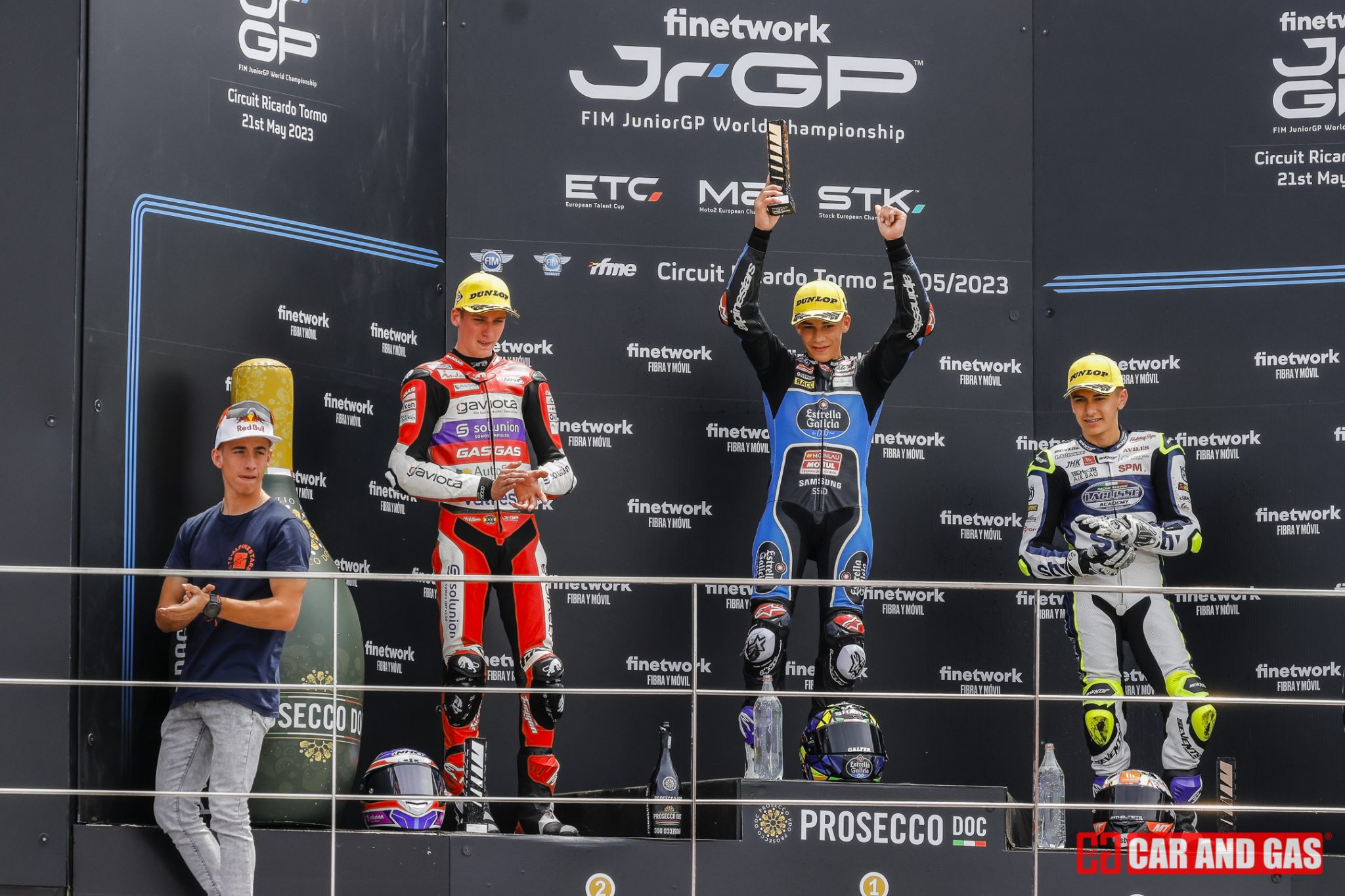 Arrancó el domingo sin los típicos warm up y si con la “Last Chance Race” en la categoría de ETC, en la que el francés Enzo Bellon se impuso en un final de “photo finish” a los españoles Edu Gutiérrez e Yvonne Cerpa. Tras un pit walk para que los aficionados vieran de cerca motos y pilotos llegó el turno a la primera carrera del JuniorGP. Salida eléctrica de Joel Esteban que quiso estirar muy pronto el grupo y eliminar contendientes, logrando escaparse junto a Piqueras de los Lunetta, Roulstone, Carraro, Morosi, Ruda y Almansa que se disputarían el tercer lugar en el cajón. Pasaron las vueltas hasta que llegaron las hostilidades por el pódium y en la penúltima vuelta. David Almansa intentó adelantar a Marcos Ruda en la curva 8 no pudiendo entrar en la curva y acabando los dos compañeros de equipo en la grava, varapalo para el Finetwork.